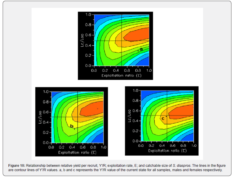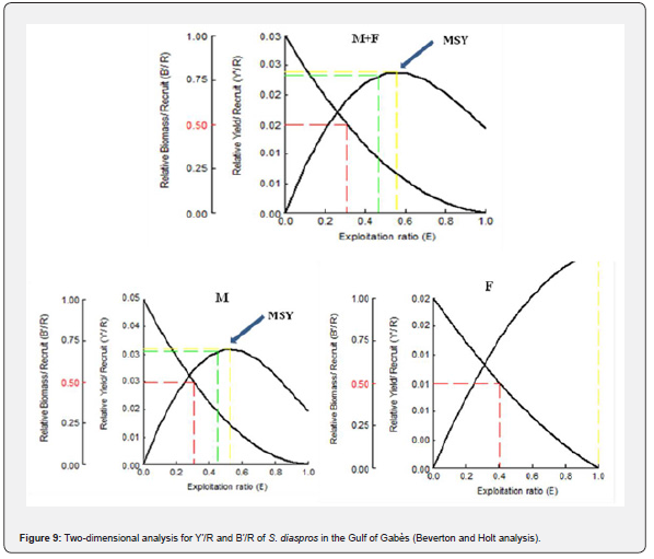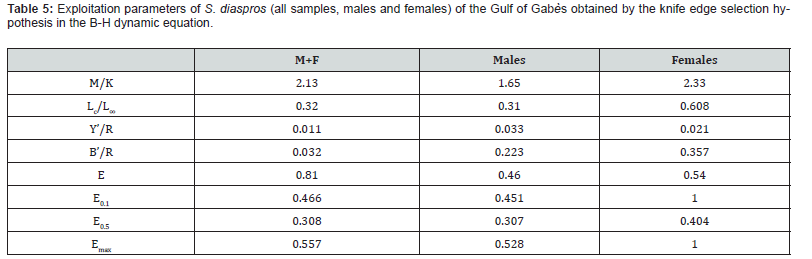 These exploitation rate of S. diaspros were obtained by the knife edge selection hypothesis in the B-H dynamic equation. The Y’/R and B’/R values were evaluated according to Lc / L∞ and M / K . The analytical model of relative yield per recruit was applied to clarify the current and optimal status of S. diaspros stock in the Gulf of Gabès (Table 5). The value of relative yield per recruit (Y’/R) was 0.011 for all samples, 0.033 for males and 0.021 for females and the value of relative biomass-per-recruit (B’/R) was 0.032 for both sexes, 0.223 for males and 0.357 for females.