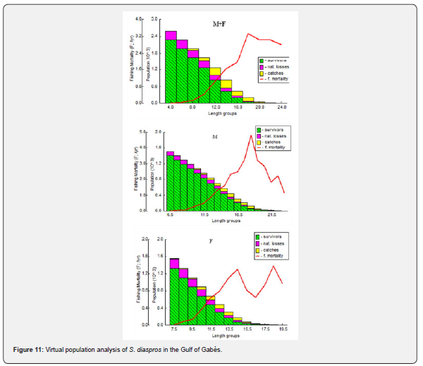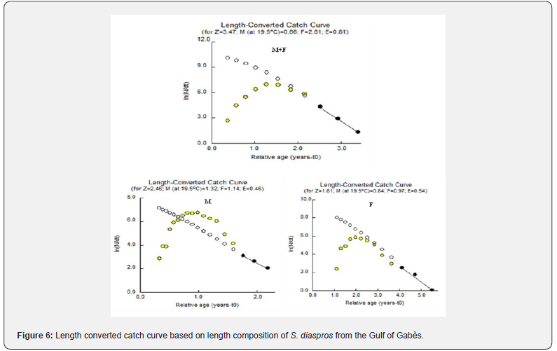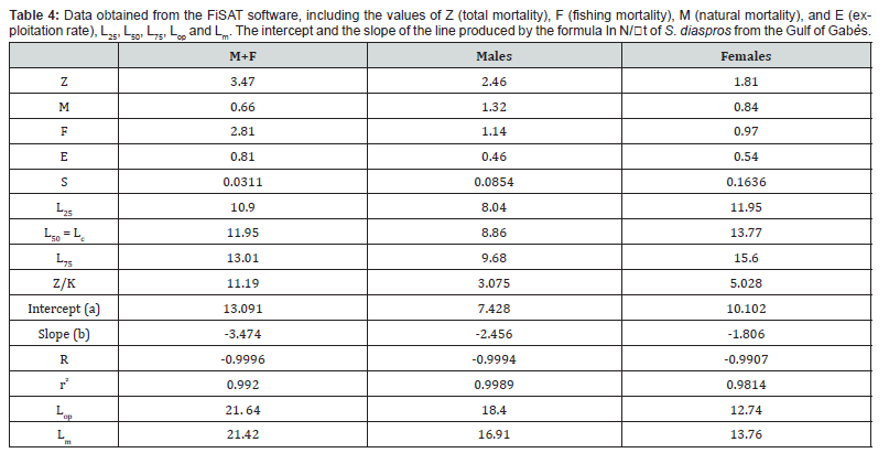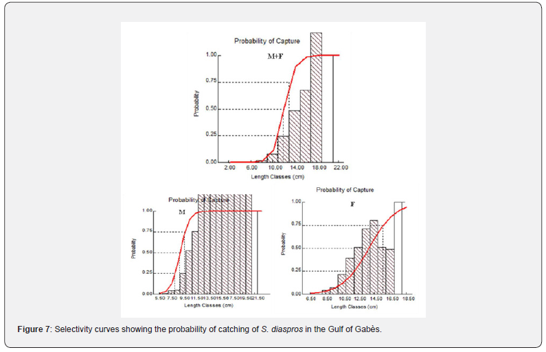 Therefore, we can note that the stock of S. diaspros, especially the females, caught off the Gulf of Gabès is overexploited and cannot achieve a sustainable fishing rate. This reflects a tendency to catch immature or maturing fish. Raising awareness among fishers about the negative impact of this practice could gradually change their behaviour and motivations.