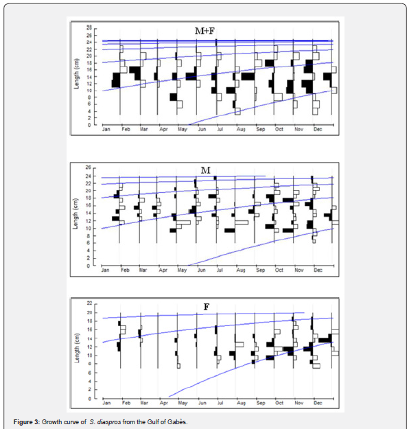 L∞ and K are function of Von Bertalanffy growth, while the value of M depends on the natural mortality rate. The recruitment period for S. diaspros in the Gulf of Gabès was determined using FiSAT II (recruitment patterns method), based on individual size frequency data.