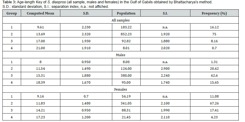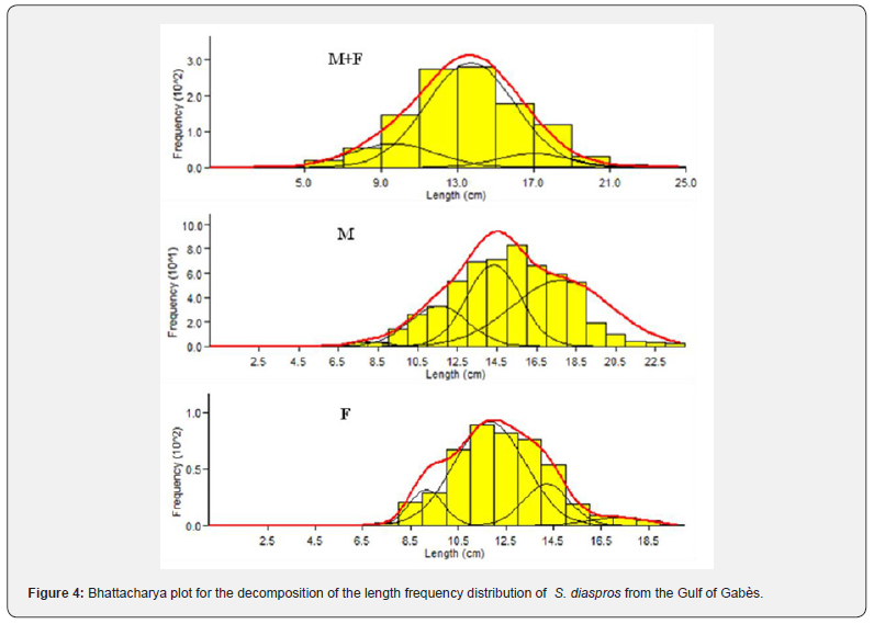 Plotting the decomposition of the length frequency distribution (Figure 4) clarified four age groups; I, II, III and IV; for all sample, males and females of the lessepsian specie S. diaspros in the Gulf of Gabès. Group III was predominantly represented among males (62.6 %), whereas Group II was more prevalent among combined sexes and females (67.26 %) (Table 3).