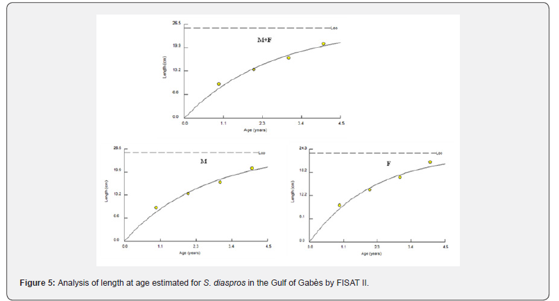 Age estimation was performed for S. diaspros in the Gulf of Gabès using an age-length key. The age-length key was developed based on the length-frequency distribution of the sampled individuals and applied to the entire population as well as separately for males and females. To construct this key, we utilized the FISAT software, which is a widely used tool in fisheries biology for analyzing fish population dynamics. FISAT allows for the efficient estimation of growth parameters and age structures based on length-frequency data. By assigning individuals to age groups according to their total length, we were able to determine the age composition of the population. This method provided valuable insights into the growth dynamics, reproductive potential, and age structure of this invasive species, essential for its management and understanding of its ecological impact in the Gulf of Gabès.