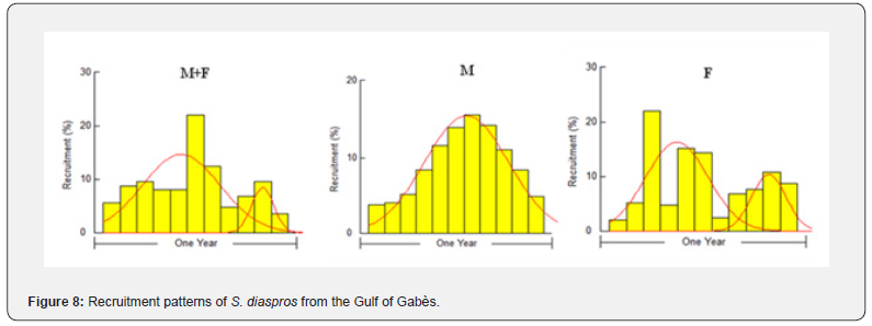 The recruitment histogram for S. diaspros shows continuous recruitment throughout the year (Figure 8), with a significant peak in the months of June-July for all sample and males but females show 2 peaks in June-July and another in October.