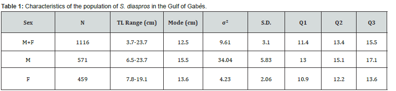 Utilizing the length-frequency data, the current study provides inferences on the population of S. diaspros in the Gulf of Gabès. We have examined the fundamental elements necessary to formulate a rational and sustainable management strategy for this species stock. Among 1116 sampled individuals, with size frequency distribution from 3.7 to 23.7 cm, the overall sex ratio (SR = 0.87) indicated a significant disparity, favoring males. The proportion of females is 46.53% and the proportion of males is 53.47%. Kartas and Quignard [51] suggest that the physiological condition of fish and fluctuations in the quantity and quality of sex-specific food may account for variations in the sex ratio and the differential susceptibility of each sex to the employed fishing gear.