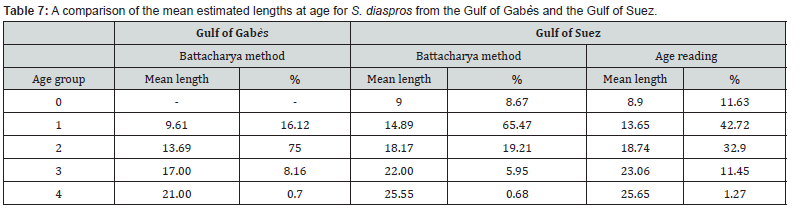 In the study conducted on S. diaspros from the Gulf of Suez, five age classes were identified using two complementary methods: the examination of growth rings on thin sections of the dorsal fin spine and the Bhattacharya method. The results indicated rapid growth during the first year of life, with individuals reaching nearly 50% of their estimated maximum length. In subsequent years, growth rate declined considerably. A comparison of the mean estimated lengths at age for S. diaspros from the Gulf of Gabès and the Gulf of Suez is presented in Table 7.