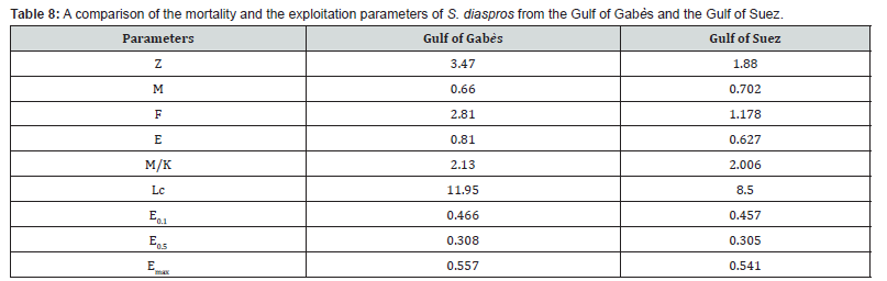 A comparison of the mortality and the exploitation parameters of S. diaspros from the Gulf of Gabès and the Gulf of Suez were resumed in Table 8.