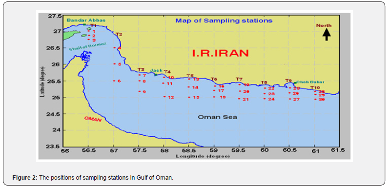 The sampling stations were selected along the Hormozgan and Sistan and Baluchestan Provinces coastline, as they cover the Iranian part of the Oman Sea from Hormoz Strait to Gowatr Gulf (Figure 2). The sampling area included 30 stations in ten transacts, represented respectively by indices from T1 to T10, while each transact comprised three stations. Sediment samplings were performed using GPS co-ordinates to record the geographical location of stations in the Spring and Fall of 2007 and 2009, respectively.