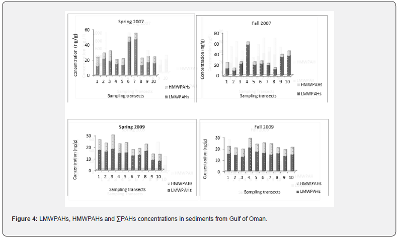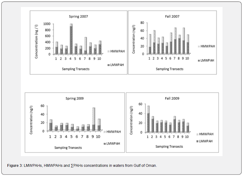 The concentrations of ΣPAHs, low molecular weight PAHs (LMWPAHs) and high molecular weight PAHs (HMWPAHs) in water from the Gulf of Oman during 2007 and 2009, are presented in Figure 3.