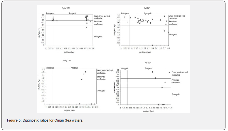 Except Transect 1 in the 2007 Fall, in all studied area and sampling times, the ratio of LMPAHs/HMPAHs were higher than 1 for water samples, indicating the input of petroleum from release of crude oil. LMPAHs/HMPAHs values increased in the Fall of 2007. Variation of molecular ratios An/Phen and Flur/Py are shown in Figure 5. Flur/Py values lower than 1 and An/Phen lower than 10 support the petrogenic sources [15]. The maximum and minimum values of An/Phen ratio in the 2007 Spring were 8.01 and 0.91, respectively. In the 2007 Fall, An/Phen ratio showed a range from 0.64 to 2.9. Similar results were observed in 2009, and all the calculated ratios were lower than 10, confirming the pyrogenic sources for poly aromatic hydrocarbons in water samples from the Gulf of Oman. Whereas, Flur/Py ratios showed values more than 1 and reached 2.9, supporting pyrogenic origins. Totally, it has been shown that PAHs are of petrohenic and pyrogenic sources in the Gulf of Oman; however, the petrogenic sources dominated over pyrogenic sources.