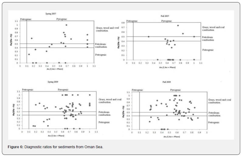 All detected values of LMPAHs/HMPAHs for sediment samples varied from 1.03 to 44.3, confirming the petrogenic source of poly aromatic hydrocarbons. Diagnostic ratios for sediments in the Gulf of Oman are shown in Figure 6. Identical pattern for An/Phen and Flur/Py variation were detected in sediments and water samples. Whereas all detected An/Phen ratios were lower than 10, the Flur/Py included both values lower and higher than 1, showing the presence of petrogenic and pyrogenic origins in the marine ecosystem of the Gulf of Oman. This observation is attributed to the high intensity of activities related to the oil industry in the Gulf of Oman and Persian Sea, connected by the Hormoz Strait.