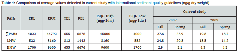 The values detected in the current study were compared with international standards (Table 1) including the National Oceanographic and Atmospheric Administration [16], Interim marine sediment quality guidelines [17] and Florida Department of Environmental Protection [18]. All determined levels in sediments from the Gulf of Oman were much lower than the international sediment quality guidelines. It means that in spite of hotspot presence in the Gulf of Oman, totally there was no risk from polyaromatic hydrocarbon pollutants for the marine ecosystem of the Gulf of Oman.