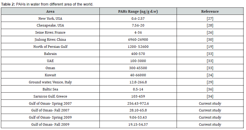 Marine sediments are classified as low, moderate, high and very highly polluted, corresponding to PAHs concentrations of <100, 100–1000, 1000–5000 and >5000 ng/g d.w, respectively [23]. Sediments from Gulf of Oman are classified in low to moderate polluted areas [24-37].