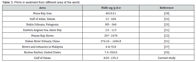 Table 3 indicates the PAH distribution in sediment samples from different parts of the world. The results of this study were much lower than ΣPAHs reported for sediments of Musa Bay in Iran [20] with high activity in oil-related industry. The detected range is close to ΣPAHs concentration in Izmir Bay [21] and far from PAH pollution in sediments of Masan Bay and Daliao River Estuary in industrial countries Korea and China, respectively [22]. Harbours are known as the most oil-polluted areas. Sediments from the Gulf of Oman contained ΣPAHs lower than Boston Harbor in United States.