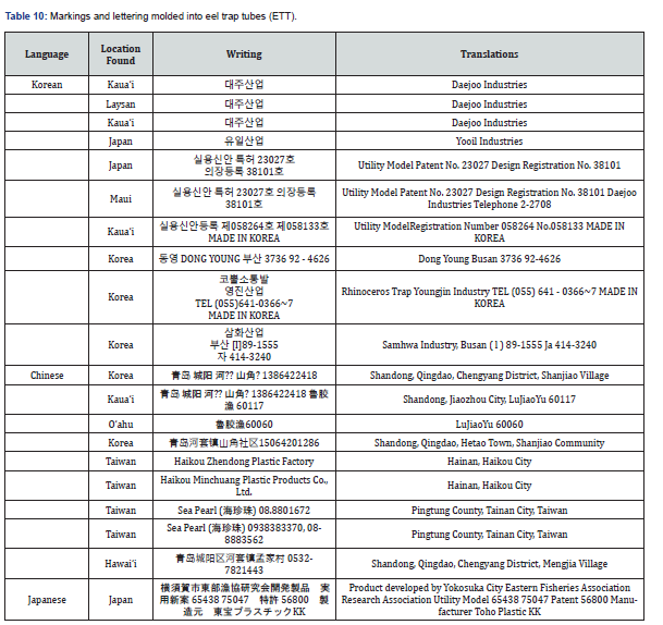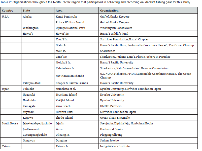 Worldwide attention to the issue of abandoned, lost or discarded fishing gear (ALDFG) has grown substantially; its causes, magnitude, impacts, mitigation methods and evidence-informed management, have been reviewed and synthesized repeatedly [1- 6] as the amount of ALDFG in the world’s oceans has increased dramatically [7,8]. This has been especially documented in the Hawaiian Archipelago (HA) where community beach cleanup groups are overly burdened by marine debris accumulations and strive to “turn off the tap” on the most abundant types of ALDFG [9,10]. Our paper is a case study of the impact of derelict fishing gear (DFG) from the international eel and hagfish trap fisheries of the North Pacific Ocean (NPO), the means to identify its sources, and efforts to reduce its discharge into the NPO. We use the term “eel” throughout this report to encompass both eels and hagfish, as the same type of trap is used for both anguilliform species. We used forensic analysis of derelict eel fishing gear (DEFG) collected throughout the margins of the NPO and site visits to fishing ports in the region, to identify specifically the sources of abundant and deadly DEFG washing ashore in the HA. We describe a conceptual framework for determining the origin of the DEFG, from a broad, ocean basin-wide view, to identifying country, region, harbor of origin, boat, and ultimately fishermen. Having identified source locations, we define the immediate causes of discharge (leakage) into the ocean and then apply an investigative framework of fisheries-specific intervention and mitigation [11].