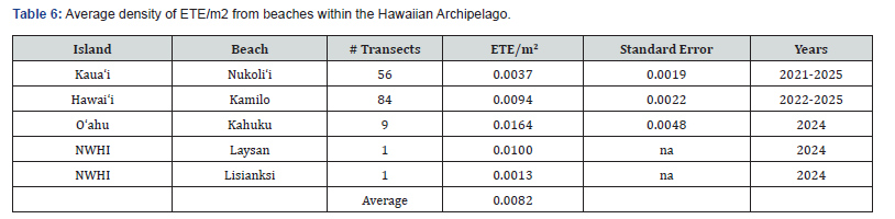 Derelict eel fishing gear (DEFG) accounted for 1.8% of the total items counted on beaches in the NWHI [20], where it increased from 0% to 30% of the items known to entangle monk seals, over the period 1987 - 1996 [42]. There are fewer quantitative accounts of DEFG from the MHI [9,10,23]. A total of 21,458 ETE and 433 ETT were recorded from the HA during our 2021-2024 project period. The abundance of DEFG in waters and on shores of the HA has the potential to impact marine life through many trophic levels via entanglement and ingestion, especially on marine-protected species.