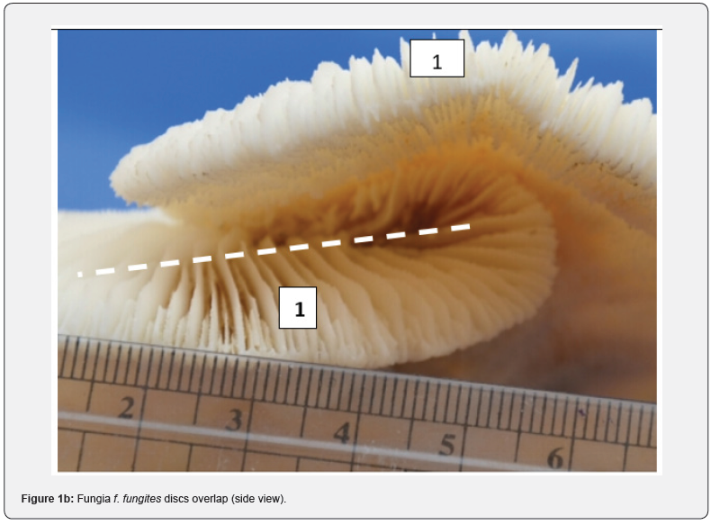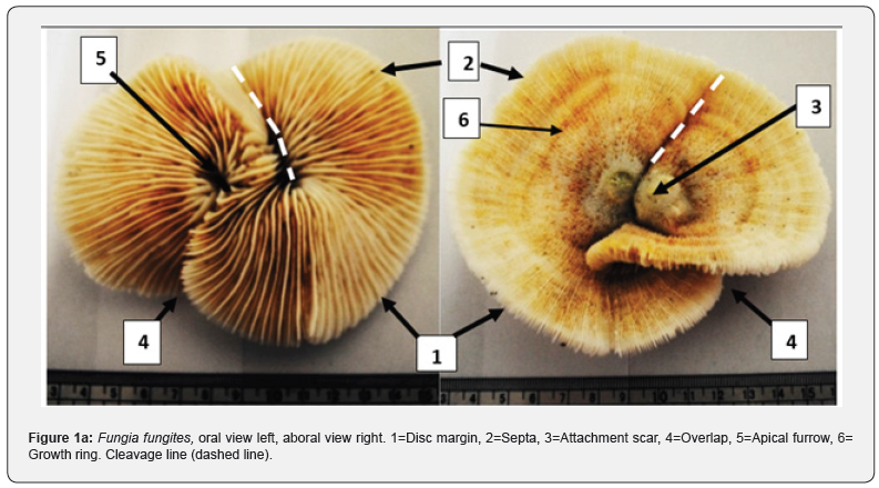 The Suakin specimen of F. fungites (Figure 1 a & b), approximately 113cm2, is firmly joined. The cleavage line is not straight and led to formation of a large and a small disc. In the small disc the attachment scar is slightly raised probably due to growth overlap. The septa, above and underneath the disc are clearly vertical.
