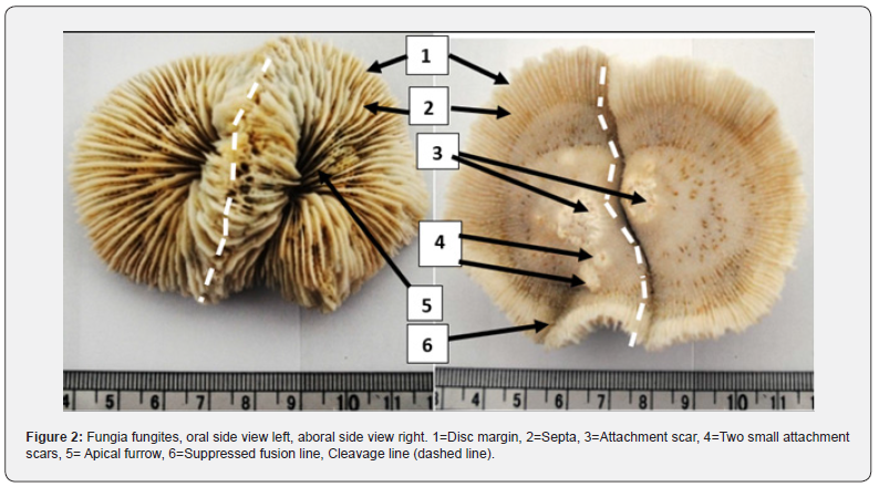 Deformity in F. fungites were observed in many specimens (Figure 3). This is probably due to settlement of the tiny larvae in a narrow confinement. As the larvae start to secrete its hard carbonate exoskeleton and grow, the confinement shaped the disc growth, attachment and morphology. This is apparent from several compressions and attachment points observed in discs. The deformed discs are either round-distorted or oval- distorted but the septa are clearly vertical.