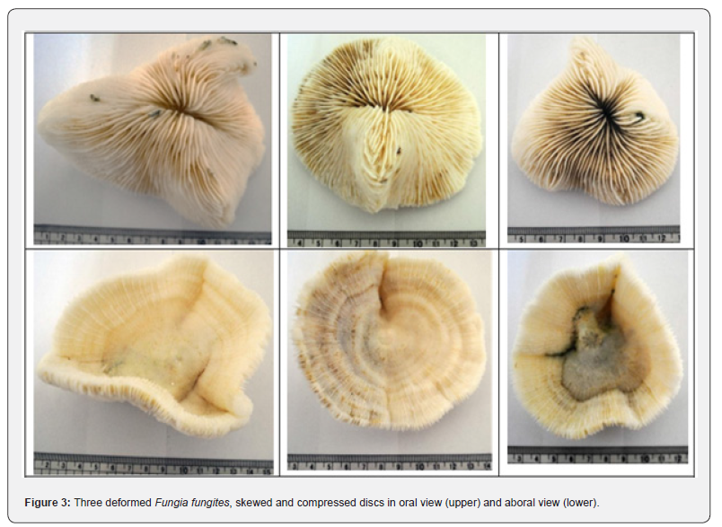 The observed disc deformities are likely a consequence from larval settlement in confined microhabitats influencing skeletal growth and disc morphology. Disc deformity in mushroom corals has been reported by Hoeksema [4], Hoeksema and Moka [9], Arrigoni et al. [12] and Eyal-Shaham et al. [13].