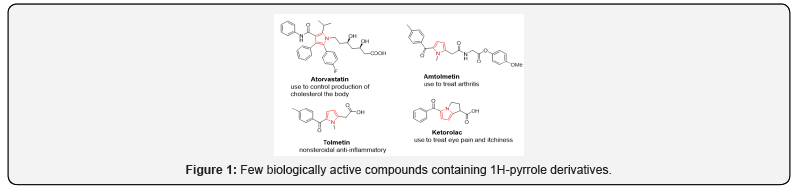 Heterocyclic molecules are cyclic molecules whose ring contains one or more heteroatoms besides carbon atom. The most common heteroatoms are Nitrogen, Oxygen and Sulphur. The heterocyclic compounds containing three to six carbons in the ring are numerous, but those containing five or six atoms are very important in the pharmaceutical world. Pyrroles demonstrate such flexibility (Figure 1) and they are valuable substructure in a collection of pharmaceuticals, involving products potent against HIV [1,2], influenza [3], cytomegalovirus [4], anticancer agents [5,6] and compounds effective against microbiological infections [7-9] e.g. bacterial and fungal. In addition, pyrroles are known as building blocks in the synthesis of alkaloids [10-13] and intermediates like 2,2’- bipyrroles, pyrroles and pigments [14-19]. Structural alteration of the pyrrole ring to create more bioactive molecules has drawn the attention of many researchers. Over the years much effort has been directed towards the development of new strategies for 2-arylpyrrole and oligopyrrole synthesis [20–27].