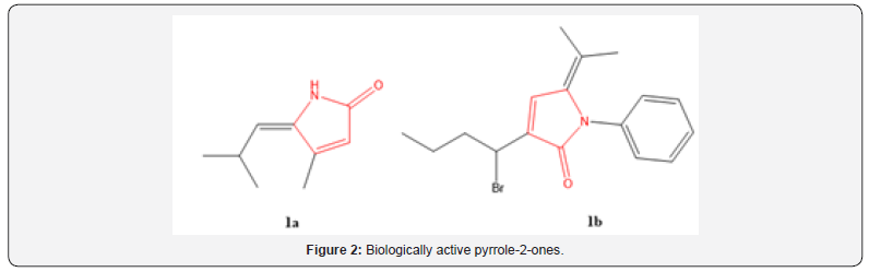 Among them, the commonly used approaches are cyclization reactions. Related dihydropyrrol-2-one (DHP) analogues, which bear a nitrogen atom in place of the oxygen in the heterocyclic ring, are more hydrolytically stable under physiological conditions [33]. DHP is a common moiety in several classes of biologically active molecules such as pulchellalactam (1a-b, Figure 2), jatropham and rolipram [34–36]. Novel dihydropyrrolone derivatives have been developed in our laboratory (Figure 3) and their bioactivities as well as in silico properties are disclosed in this article.