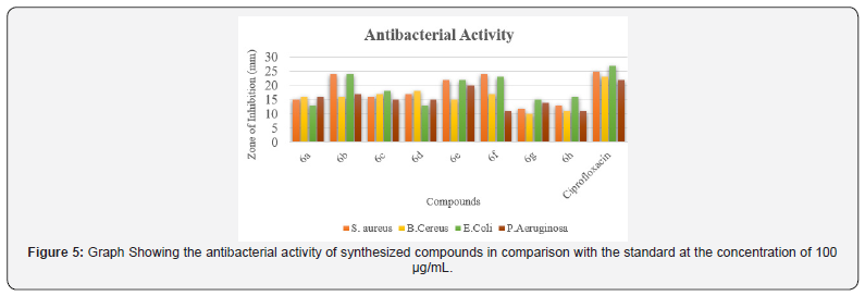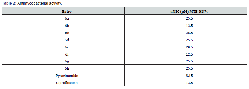 All novel developed molecules 6a-h were evaluated to in vitro antimycobacterial activity against MTB H37v employing the MABA method [29]. Ciprofloxacin and pyrazinamide were used as reference drugs. The outcomes of the in vitro antimycobacterial potency are outlined in (Table 3) as MIC. Among all the synthesized molecules 6b and 6f demonstrated a similar mycobacterial inhibitory potency at a MIC of 12.5 μM compared to standard drug Ciprofloxacin (Figure 7).