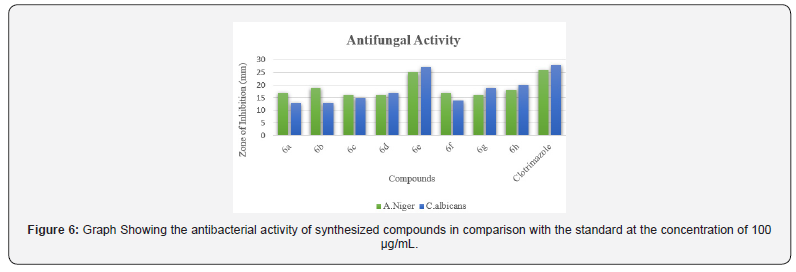 The Synthesized compounds under study were screened for their antimicrobial activity by cup plate method. The bacteria screened were Staphylococcus, Bacillus, Escherichia coli and Pseudomonas aeruginosa and the fungi screened were Aspergillus niger and Candida albicans. Ciprofloxacin and Clotrimazole were used as standards for antibacterial studies and antifungal studies respectively. The details are given in Table 2. To analyze the impact of the nature of (Ar-)Substitution on the antimicrobial activity, derivatives incorporating phenyl, p-chloro phenyl, p-methyl phenyl,p-methoxy phenyl, o-chlorophenyl, p-ethyl phenyl, p- ethoxy phenyl and 2-thienyl were synthesized. The synthesized compounds containing chloro and 2-thienyl group has shown excellent antimicrobial activity whereas the rest of the series shown good to moderate antimicrobial activity against bacterial and fungal strain compared to standards (Figures 5 & 6).