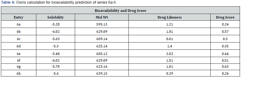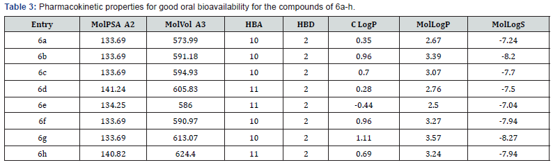 These properties are calculated and discussed based on Lipinski’s rule and its component. The compounds 6a-h fulfill Lipinski’s rule and show good drug-likeness score which is positive values (Table 5). Milog P of these compounds was found below 5 that means these shows good permeability across the cell membrane. The logS values are greater than -4 which predict that these molecules have good aqueous solubility. TPSA below 160 Ǻ2, n violations =1 or <0 it means compound easily bind to the receptor, molecular mass >500, No. hydrogen bond donors ≤ 5 (The sum of OHs and NHs), No. hydrogen bond acceptor ≤ 10 ( The sum of Os and Ns).