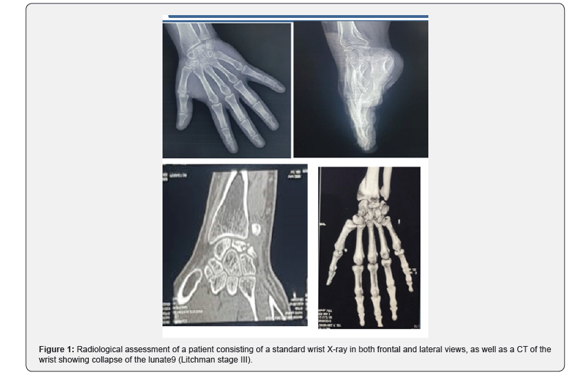 Kienböck’s disease was first described in 1910 by Robert Kienböck, an Austrian radiologist, who identified it as avascular necrosis of the lunate associated with painful symptoms and loss of wrist mobility [1]. Initially considered a form of chondromalacia, its pathophysiology has evolved over time, and it is now recognized as a multifactorial condition involving vascular, mechanical, and anatomical anomalies [2]. In 1977, Lichtman proposed a fourstage classification based on the radiographic progression of the disease, which helps adapt therapeutic strategies depending on the severity of bone and joint involvement [2]. With the improvement of imaging techniques and a better understanding of risk factors, new therapeutic approaches, including resection of the first row of carpal bones, have been developed to preserve wrist function and alleviate pain [3]. Kienböck’s disease at stage IV is characterized by advanced destruction of the lunate with arthritic involvement of the radiolunate and midcarpal joints. At this stage, surgical options should aim to relieve pain while maintaining acceptable joint function. Among these options, resection of the first row of carpal bones (PRC) stands out as an effective alternative to total wrist arthrodesis and full joint prostheses. The study by De Smet et al. evaluated the results of PRC in 21 patients with advanced Kienböck’s disease. After an average follow-up of 67 months, 76% of the patients experienced mild or no pain, and grip strength improved from 19 kg to 26 kg (65% of the strength of the unaffected side) [4]. These results highlight that PRC provides significant functional gains, although some patients may experience persistent pain. Furthermore, Marcuzzi et al. studied a variant of PRC combined with the implantation of a pyrocarbon prosthesis (RCPI implant) to preserve wrist stability after bone resection. The average follow-up of 27.6 months showed significant pain reduction, improved range of motion, and satisfactory grip strength, with no major complications such as dislocation or implant fracture [5].