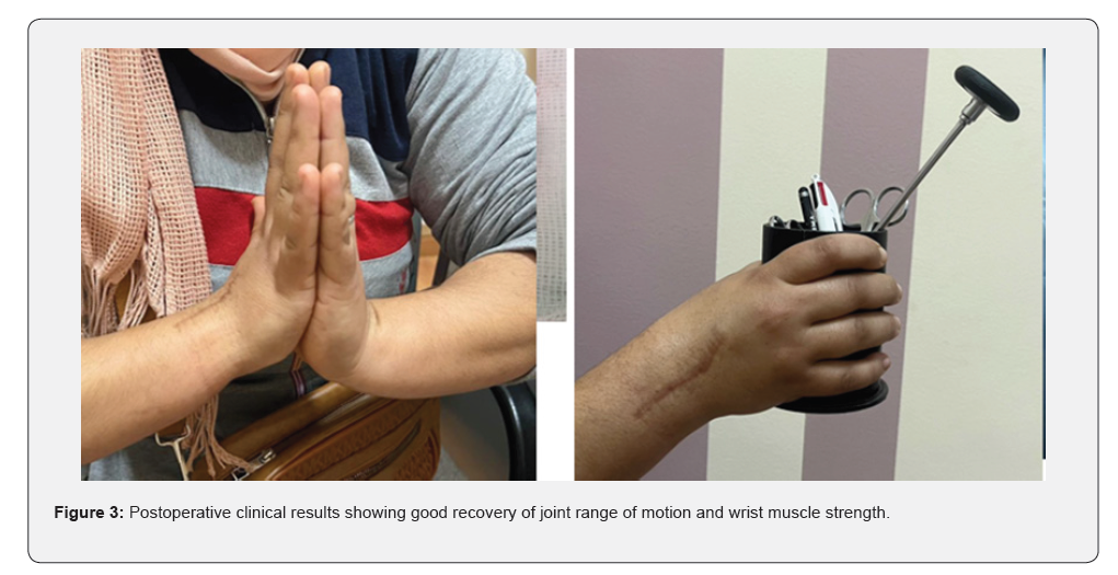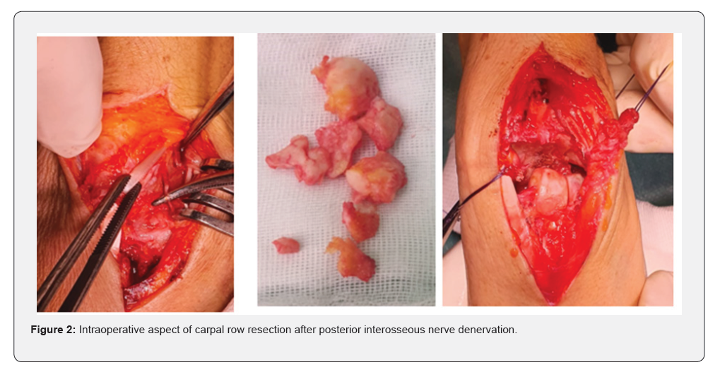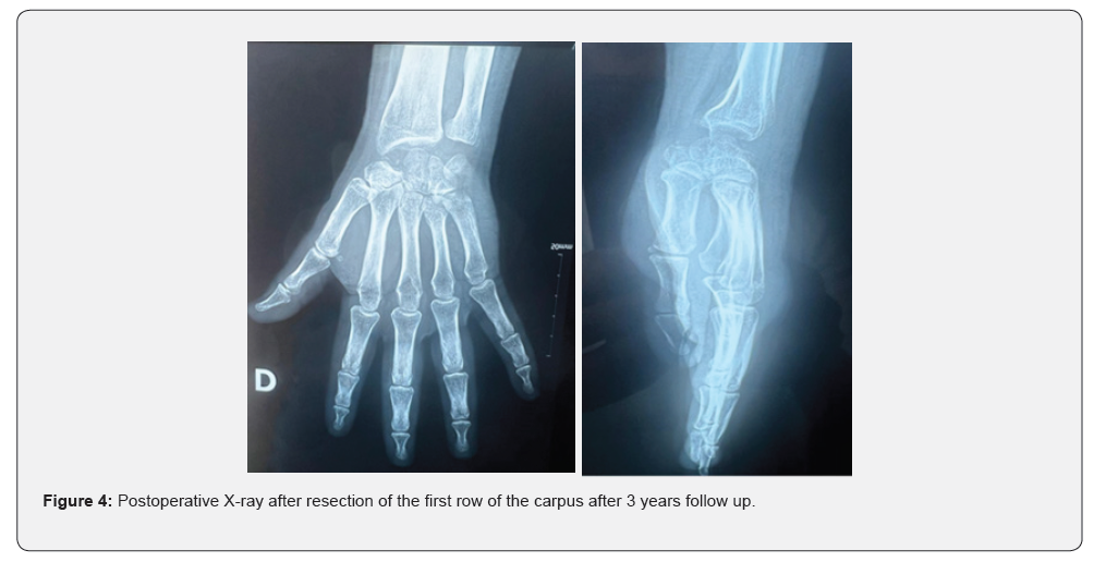 A radiological assessment consisting of a conventional wrist X-ray in both frontal and lateral views, as well as CT, was performed on all patients, allowing for classification of the patients at stage III and IV of Lichtman (Figure 1). All patients underwent the same surgical technique through a posterior approach. The procedure involved opening the retinaculum and denervation of the NIP (nervus interosseus profundus). A T-shaped arthrotomy was performed, followed by resection using a cold blade while preserving the anterior capsuloligamentous plane (Figure 2). Pain significantly decreased in all patients. The VAS score decreased from an average of 6.5 ± 1.2 before the procedure to 2.3 ± 1.1 at the last follow-up (p < 0.01). This pain reduction was consistently observed throughout the follow-up period. Range of motion (flexion/extension) also showed notable improvement. The average flexion/extension increased from 65° ± 10° preoperatively to 85° ± 8° postoperatively (p = 0.02). This improvement allowed the patients to regain satisfactory functional mobility (Figures 3 & 4). Grip strength significantly improved. It increased from 55% ± 8% of the strength of the healthy side to 72% ± 6% at the last follow-up (p = 0.03). The functional wrist score (DASH) decreased, reflecting an improvement in quality of life. The average score dropped from 32 ± 7 preoperatively to 14 ± 5 postoperatively (p < 0.01). No major complications were reported during the follow-up. One patient developed mild carpal osteoarthritis at 4 years postoperatively, but this did not require further intervention.