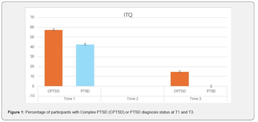 At T1, 54 participants were assessed, 31 (57.4%) met criteria for Complex- PTSD (CPTSD) and 23 (42.6%) for PTSD. By T3, only 8 participants (14.8%) still met diagnostic criteria for CPTSD, and none met criteria for PTSD, indicating a high rate of diagnosis status remission. See Figure 1.