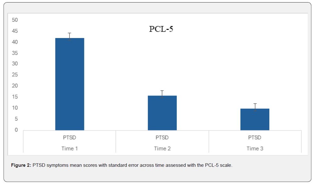 A repeated-measures ANOVA revealed a significant effect of time on PCL-5 scores, F (2, 102) = 58.67, p < .001, η² = 0.53, indicating a large effect size. Post-hoc pairwise comparisons showed significant reductions in PCL-5 scores from T1 (M = 54.43, SD = 13.87) to T2 (M = 15.80, SD = 10.23), t (53) = 18.67, p < .001, d = 2.58, and from T2 to T3 (M = 9.87, SD = 7.86), t (53) = 6.89, p < .001, d = 0.95 showing a large effect size in both comparisons. See Table 1 and Figure 2.