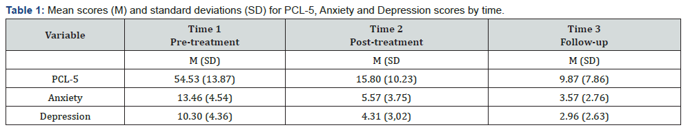 A repeated-measures ANOVA revealed significant differences across the three time points (T1, T2, T3) for all variables: PCL-5, F(2, 102) = 58.67, p < .001, η² = 0.53; Anxiety, F(2, 102) = 29.84, p < .001, η² = 0.37; Depression, F(2, 102) = 21.45, p < .001, η² = 0.30. Post-hoc pairwise comparisons using paired t-tests indicated significant reductions in scores from T1 to T2 and from T2 to T3 for all variables. Effect sizes (Cohen’s d) ranged from medium to large, with the largest effects observed between T1 and T2 (PCL- 5: d = 2.58; Anxiety: d = 1.71; Depression: d = 1.37). These results demonstrate significant improvements in all three variables (PCL- 5, Anxiety, Depression) over time, with large effect sizes observed for the comparisons from T1 to T2 with moderate to large effect sizes from T2 to T3.