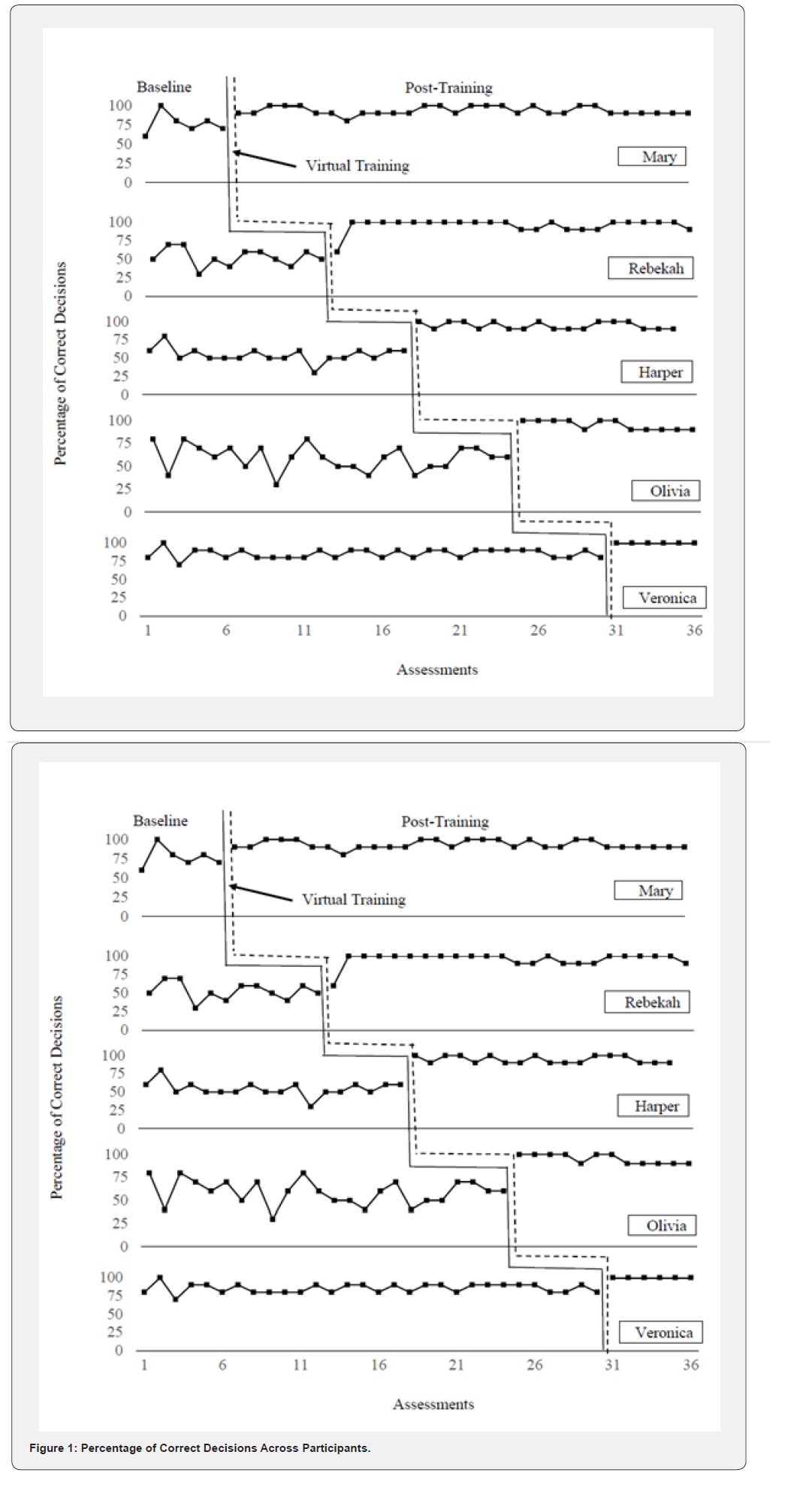 The average percentage of correct decisions made independently using the CDC method during the post-training condition was noticeably higher than at baseline (M = 94.89, SD = 6.40), with scores ranging from 93.33% to 100%. Mary’s scores were stable and between 80% to 100%. Her lowest score (80%) only occurred once. Similar to Mary, Rebekah achieved her lowest score (60%) on a single occasion, whereas all other evaluations were markedly higher (i.e., 90% to 100%). Harper’s scores remained consistent and never fell below 90%. Compared to baseline, Olivia’s performance markedly stabilized and improved during the post-training condition while Veronica showed perfect accuracy. These changes were immediate and observed in all participants only after the virtual training was completed Figure 1. Based on the observed improvements in decision-making accuracy among all participants following the virtual training, and the stable baseline performances of subsequent participants, these results indicate that experimental control was achieved.