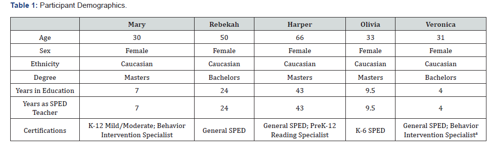Five participants were recruited via email using purposive sampling. The principal investigator emailed three in a Midwest state and asked them to share a recruitment email about the study with their special education teachers. Interested participants then contacted the principal investigator for more information. Four of the participants were recruited this way while the fifth participant heard about this study from a colleague, was interested in the topic, and wanted to participate. The five in-service special education teachers were employed at different schools in a midwestern state. Their demographic information is in Table 1.