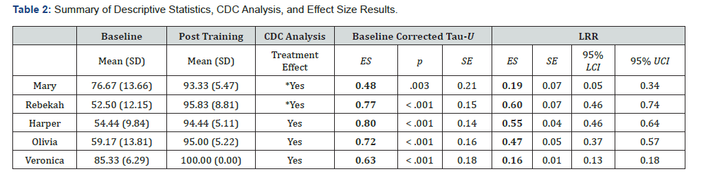 Another point related to effect sizes was calculating CDC lines/results for Mary and Rebekah, who were the first two tier participants which resulted in their post-training data to exceed 23 data points that previously was “incalculable” due to limitations in the most updated guidance on the CDC method. This limitation is perplexing because, tacitly, it should not matter how many data points are in the post-baseline phase. Further, calculating CDC lines to corroborate results of a study are not unlike nonoverlap effect sizes since data is looking for a number of points either above or below the superimposed mean and trend lines. Nevertheless, one way to adhere to the 23 data point maximum was to randomly generate 23 data points of post-training for Mary and Rebekah which was repeated five times using a random number generator. Results were the same as for the other three participants whose post-training data did not exceed 23 points. Consequently, this is the first study to use this approach to calculate CDC results.