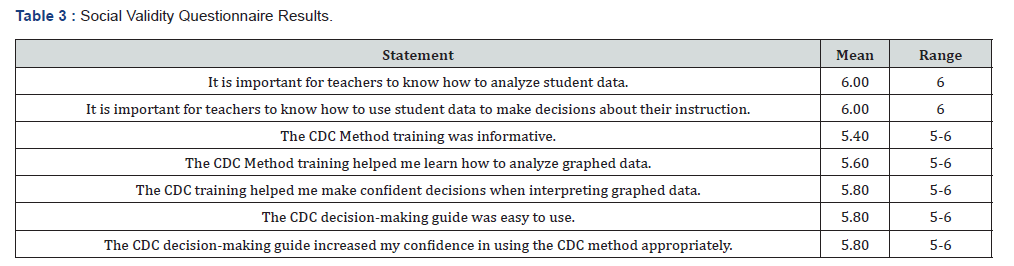 The questionnaire also included three open-ended questions. The first question asked participants to comment on what they liked about the CDC training. All five participants responses to this question reflected a general theme was the ability to use the CDC method to analyze and share data more effectively. The second question asked for any remaining questions related to the CDC training. One participant responded with a request for assistance with CDC line creation in order to analyze her own student data. The third open question asked participants to identify the advantages of employing the CDC method when examining graphed data in the role of a special educator. All five participants’ answers reflected one main theme: employing the CDC method would enhance their ability to effectively analyze and utilize student data for purposes such as progress monitoring and assessing the efficacy of interventions.