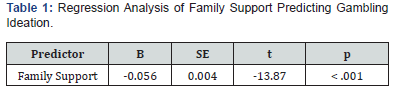 Interpretation: A linear regression analysis was conducted with 11,631 undergraduate students to test whether emotional support from family predicted gambling ideation. The result showed a statistically significant model, F(1, 11629) = 192.45, p < .001, with an R² of 0.016. Family support significantly predicted lower levels of gambling ideation (B = -0.056, SE = 0.004, t = -13.87, p < .001). This supports the hypothesis that family support acts as a protective factor, consistent with previous studies [27] Table 2.