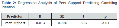 Interpretation: A linear regression analysis was conducted with 11,631 undergraduate students to examine whether peer support predicted gambling ideation. The regression model was statistically significant, F(1, 11629) = 9.41, p < .01, with an R² of 0.0008. The result indicated that peer support negatively predicted gambling ideation (B = -0.013, SE = 0.004, t = -3.07, p < .01), suggesting that those who perceived more supportive friendships reported slightly fewer gambling-related thoughts. Although statistically significant, the effect size was extremely small, indicating minimal practical influence Table 3.