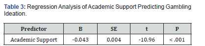 Interpretation: A linear regression analysis involving 11,631 undergraduate students was conducted to determine the impact of academic support on gambling ideation. The model was statistically significant, F(1, 11629) = 120.14, p < .001, with an R² of 0.010. Academic support significantly predicted gambling ideation (B = -0.043, SE = 0.004, t = -10.96, p < .001), indicating that students who perceived greater academic support were less likely to report gambling-related thoughts. This aligns with prior findings that strong emotional and mentoring support in academic settings serves as a protective factor against maladaptive behaviors Table 4.
