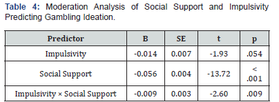 Interpretation: A moderation analysis using a linear regression model was conducted to examine whether family social support moderates the relationship between impulsivity and gambling ideation among 11,631 undergraduate students. The overall model was statistically significant and explained 1.7% of the variance in gambling ideation (R² = 0.017). The interaction between impulsivity and social support was significant (B = –0.009, SE = 0.003, t = –2.60, p = .009), indicating that social support moderates the relationship. As social support increases, the influence of impulsivity on gambling ideation becomes more negative. This suggests that social support buffers the impact of stress vulnerability (high impulsivity) on gambling tendencies, supporting hypothesis 4.