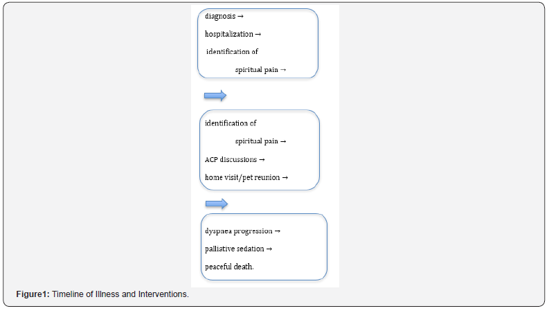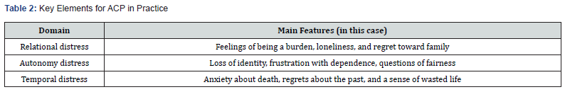 Holistic care was supported by contributions from all disciplines. Physicians monitored disease progression and initiated ACP conversations. Nurses offered continuous bedside presence and empathic listening. Pharmacists explained opioid titration, counteracting stigma and fear of addiction [5]. Rehabilitation staff supported mobility, and the medical social worker coordinated family meetings and home visits. Weekly team meetings ensured a shared understanding of her condition and allowed adjustments in care plans. Multidisciplinary recognition of spiritual pain has been recommended in the literature as essential for effective support [11]. In late April, during temporary clinical stability, structured ACP conversations began. The physician asked, “What matters most to you in the time ahead?” She responded, “I want to be with my son and his wife, without causing trouble.” Nurses further explored her wishes, and she confirmed her preference to avoid invasive treatments such as intubation. An advance directive and DNAR order were documented in writing. She expressed relief, saying, “Now it is written clearly.” This aligns with evidence that ACP documentation provides psychological reassurance and improves care consistency [8,10]. Her family initially hesitated but accepted the decision after hearing the patient’s voice directly, echoing studies showing that family involvement strengthens ACP effectiveness [13]. One of her strongest wishes was to return home and see her pet dog. PCT coordinated logistics, including portable oxygen and family support. During Golden Week, she visited home twice [14]. On returning, she smiled, “Now I can rest in peace.” Such small but meaningful goals are consistent with dignityconserving interventions that have been shown to alleviate existential suffering [15] as the realization of hope. By mid-May, her symptoms progressed, and dyspnea worsened. Morphine was initiated and gradually titrated, consistent with guidelines for breathlessness in advanced cancer [7]. Despite pharmacological management, she developed anxiety and delirium. Nurses provided reassurance and environmental adjustments (private room, sunlight, music), yet distress persisted. Following family discussions, continuous palliative sedation was introduced with morphine and benzodiazepine [16]. The decision aligned with her documented preferences and family agreement, demonstrating the value of ACP in guiding end-of-life care [14]. She passed away peacefully in early June, surrounded by her family (Table 2).