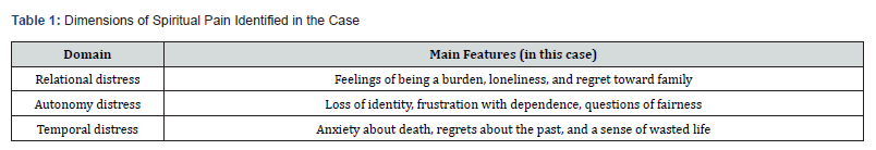 Spiritual pain in advanced cancer has been described as one of the most profound forms of suffering, encompassing meaning, identity, and relationships [1]. Elderly patients are especially vulnerable, as they face existential issues such as acceptance of mortality and reconciliation with past choices [2,3]. International guidelines emphasize that spiritual care is central to palliative medicine. The European Association for Palliative Care (EAPC) defines spiritual care as addressing suffering in multiple dimensions, while the World Health Organization (WHO) similarly promotes a holistic model that integrates physical, psychological, social, and spiritual domains [4-6]. In Japan, the Ministry of Health, Labour and Welfare has issued guidelines on decision-making at the end of life, highlighting the importance of Advance Care Planning (ACP) and spiritual needs [7]. ACP has been shown to improve alignment between patient preferences and care received, reduce unwanted interventions, and support families during bereavement [8,9]. A multinational consensus further emphasizes that ACP should be understood as a process of ongoing dialogue, not a single event [10].