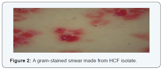 The Histoplasma capsulatum var Farciminosum isolate which was found from Aklilu Lemma Institute of Pathobiology, Addis Ababa University was reexamined with gram staining (Figure 2) and sub cultured in which the mycelial form of the organism grows slowly under aerobic conditions at 27oC on a media, enriched Sabouraud’s dextrose agar, 2.5% glycerol and 0.005% chloramephenicol (SDA) (Figure 1) for its activeness and showing characteristic morphology of the target fungal colony. Organisms are usually surrounded by a ‘halo’ when stained with Gram stain [3].