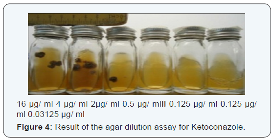 Ketoconazole in the range of 0.03125 μg/ ml to 16 μg/ ml (standard) and saline water were inoculated with the test fungus. Antifungal susceptibility testing broth macro dilution testing was performed in accordance with the guidelines in NCCLS document [20].