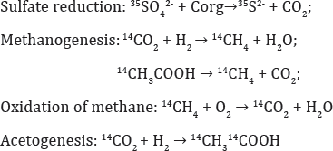 Radiotracer techniques may be used for integral assessment ofthe activity ofa microbial community as a whole. The techniques for determination of the rates of terminal stages of petroleum biodegradation (sulfate reduction and methanogenesis) using radioactively labeled Na235SO4, NaH14CO3, and 14CH3COONa have been developed by Russian researchers - Ivanov MV (1956) [3], Belyaev SS [4,5] and co-workers. Introduction of radiolabeled substrates (35SO42-, 14CO2, 14CH3COOH) into formation water results in synthesis of labeled radioactive products and makes it possible to assess the rates of the relevant processes: