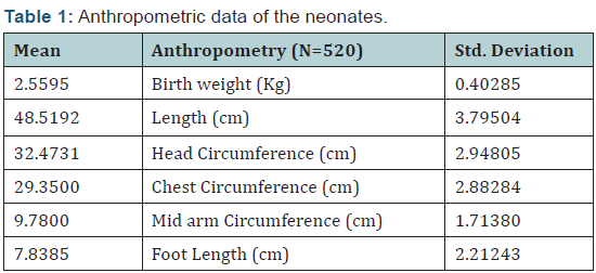 This study was carried out in the Pediatric department, AVBRH hospital, Sawangi (Meghe), Wardha. AVBRH hospital being a tertiary care hospital situated in a rural area and all types of deliveries take place here. It was a hospital based cross-sectional study. The study was done on 520 live born neonates who were born during the month of Jan 2013 to July 2013. All newborn infants were term babies (gestational age 37-42 weeks) included in the study. Babies of mothers with risk factors, premature, and malformed babies were all excluded. Equipments used during the study were of flexible, non-stretchable measuring tapes, electronic weighing machine, and infant meter. Nude weight of the baby was taken in a beam balance electronic measuring scale. Length were recorded to the nearest of 0.1cm on an infant meter with baby supine, knees fully extended and soles of the feet held firmly against the foot board and head touching fixed board. Head circumference (HC) was measured by putting the measuring tape interiorly at glabellas and posterior along with the most prominent point. Chest circumference (CC) was measured at the level of lipoid cartilage by measuring tape to the nearest of 0.1 cm. Mid-arm circumference (MAC) was measured midway between acromion process and olecranon process of left arm to the nearest of 0.1 cm by measuring tape. Foot length was measured from an imaginary line tangential to the posterior prominence of the heel to the tip of the longest toe (the first or the second toe). Babies left foot was used to maintain standard during study period. All the measurements were recorded by trained social worker within 48 hour of birth.