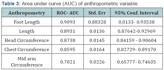 Out of 520 neonates, there were 267 male and 253 female babies. Means and standard deviation of anthropometric variables are shown in (Table 1). It was observed that weight, length, HC, CC, MAC and FL were higher in male babies than in female babies but not statistically significant. Table 2 shows the correlation coefficient between birth weight and anthropometric variables of the neonates, where birth weight significantly correlated (p<0.000) with other anthropometric variables i.e. FL, length, HC, CC and MAC. Foot Length attained the highest correlation with birth weight (r = 0.715) while MAC attained the lowest (r = 0.355). Also, FL had the highest coefficient of determination (R2 value= 0.511). This implies that FL has the highest proportion (51.1%) of variation in weight. Table 3 demonstrated the best discrimination of LBW, as detected by ROC- area under curve (AUC), was obtained by FL (AUC = 0.909, 95% CI 0.0133- 0.93538) followed by length (AUC = 0.89, 95% CI 0.87642-0.92969). Length of 49cm, HC of 33cm, MAC of 9.5cm, CC of 30cm and FL of 8cm were the corresponding cut-off values with the best combination of sensitivity and specificity for identifying LBW babies as shown in (Table 4). Also, the superiority of FL over other anthropometric indicators in the identification of LBW with 84.85% sensitivity and 85.94% specificity.