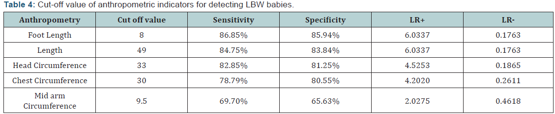 Some studies have recommended that FL, HC, MAC and HC may be used as anthropometric surrogates to identify LBW babies [28-30]. Therefore we considered all these anthropometric measurement. Thus the result of this study shows FL are among the best surrogate parameters to identify LBW babies which can be used at community level by health workers in rural areas.