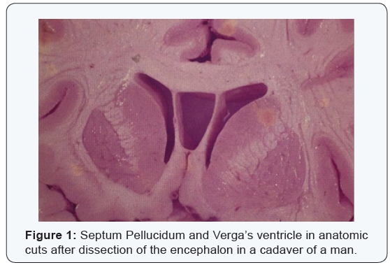 After the dissection of the encephalon in a cadaver of a man, we observed in anatomic cuts the Verga’s ventricle (Figure 1). The pathology and the image of the septum pellucidum and the Verga’s ventricle are an anatomic rarity. The “cavum of the septum pellucidum” is a cavity filled with the cerebrospinal fluid which is situated between the frontal horns of the lateral ventricles. The “cavum Vergae” is a posterior digiti form extension elongated from the cavum septum pellucidum which is located among the fornices. The cavum septum pellucidum can occur in an isolated manner, however, the cavum Vergae only occurs in conjunction with the cavum septum pellucidum. When the two occur, the correct Latin nomenclature is cavum septi pellucidiet Vergae. In the daily use, the combination usually is called cavum of the septum pellucidum [13]. The septi pellucidi are two paired triangular membranes (“leaflets”) which develop approximately with 12 weeks of gestational age. The embryonic septi pellucidi are not fused, and the cavity between them is filled with cerebrospinal fluid. This simple cavity between the two leaflets receives two different names. Anterior to the foramen of Monro it is called “cavum of septum pellucidum”. The posterior continuation between the fornices is called “cavum Vergae”. Normally, the two septi pellucidi fuse, and the cavity between them is obliterated. The fused membranes become the septum pellucidum. The presence of the cavum of the septum pellucidum usually is asymptomatic and is an alteration of the type “don’t touch”, found accidentally in the image exams. The computed tomography and the magnetic resonance imaging of these two entities show a cleft cavity not much visible and a prominent collection measuring various millimeters in diameter. In rare cases, these pathologies exceptionally increased determine an expansive effect, displacing laterally the fornices and the leaflets of the septi pellucidi. Those two pathologies should not be confused with a “cavum velum enterpositum”, which is the space of the triangular cerebrospinal fluid, thin, which recovers the thalamus and the third ventricle. The “cavum velum interpositum” usually occurs without the cavum septi pellucidi.