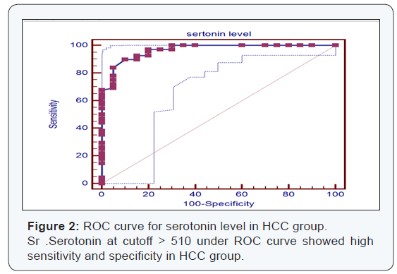 Results: Cirrhotic Patients presented with HCC showed significantly higher levels of serotonin, alpha fetoprotein, albumin and white blood cell count compared to pure cirrhotic group without HCC, however, HCC patients showed lower levels of AST, ALT, bilirubin and platelet count compared to cirrhotic patients. HCC patients were more in elder, associated with male gender and showed shorter prothrombin. A significant positive correlation between serum AFP and serotonin. r=0.594, P<0.001 AFP at 0.5 ng /ml is a cutoff with sensitivity 100%, specificity 70%, PPV 91.9% and Accuracy 97.6% respectively for diagnosis of HCC while Sr. Serotonin >510ng/ml is a cutoff with 89.71% sensitivity, 85% specificity, 95.3 % PPV, 70.8 % NPV and 96.6 % accuracy respectively for diagnosis of HCC.