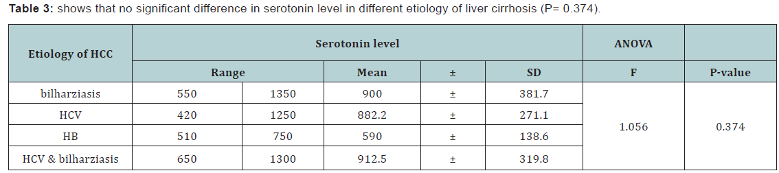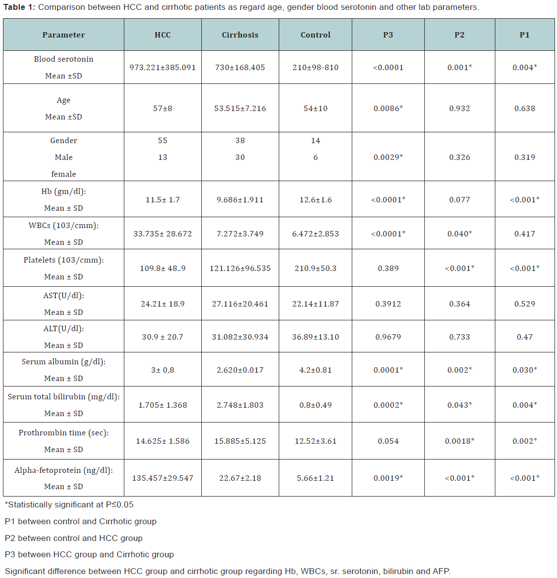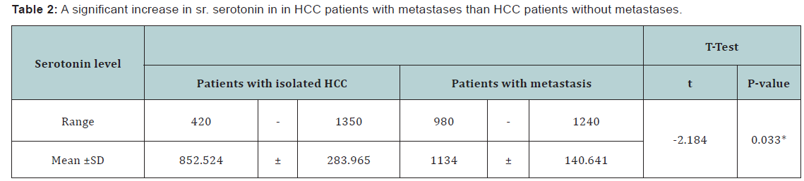 How to cite this article: Elsayed I E, Mohamed Abdel R K, Nada F E, Mohamed A H, Ehab Ahmed A-E. Serum Serotonin as a Novel Marker for Hepatocellular Carcinoma. Adv Res Gastroentero Hepatol. 2016; 1(5): 555571. DOI: 10.19080/ARGH.2016.01.555571